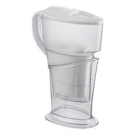 Eine stilvoll geschwungene Glaskaraffe, mit einem funktionellen Aufsatz und individuellen Filterkartuschen, gefertigt aus hochwertigen und recyclebaren Kunststoffen, garantiert beste Qualität.